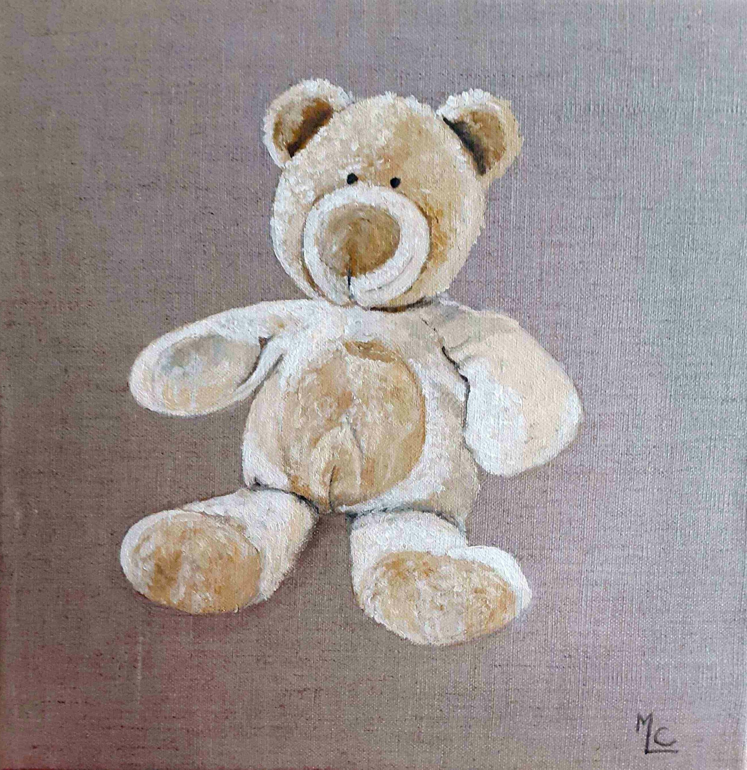 Tableau du doudou de l’enfant sur une toile de lin, à poser dans la chambre.